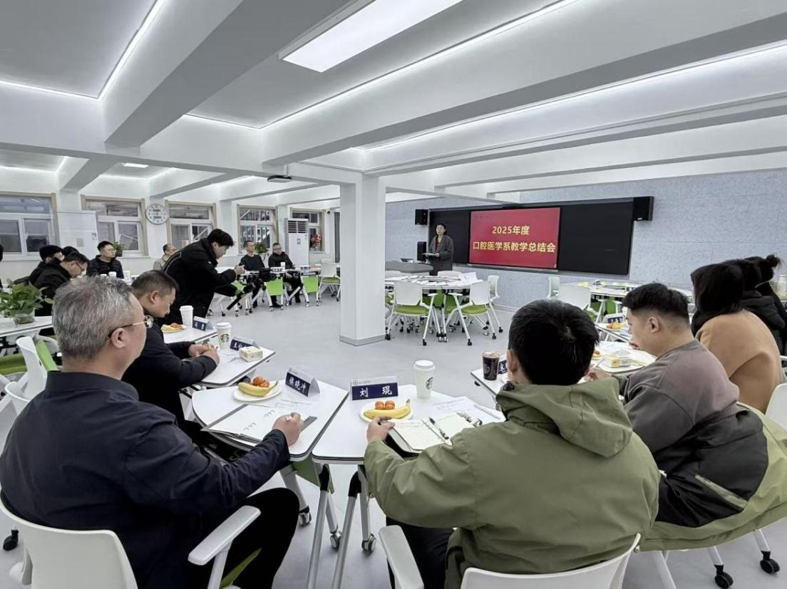 会上,口腔医学系各核心工作板块负责人依次汇报工作成果。李刚教授、杨振华教授分别围绕口腔预防医学、口腔正畸学的课程建设成效、教学改革举措及未来优化方向展开详细阐述,展现了专业课程建设的扎实功底与创新思路;王海雪、朱敏老师聚焦临床实习教学,重点汇报了实习安排、技能培养、质量管控等关键环节的实施情况,分享了提升学生临床实践能力的宝贵经验;董培媛老师针对教学管理工作,从教学计划执行、教学督导检查、师生反馈处理及学生成绩、获奖情况等方面进行全面总结,为后续教学管理提质增效提供了有力参考;冯微微老师详细介绍了口腔实验教学的场地建设、设备维护、实验课程优化等情况,凸显了实践教学对人才培养的重要支撑作用;侯晓冲主任则对口腔医学系 2025 年度整体工作完成情况进行系统性复盘,既肯定了各板块的突出成绩,也初步梳理了工作中存在的不足。