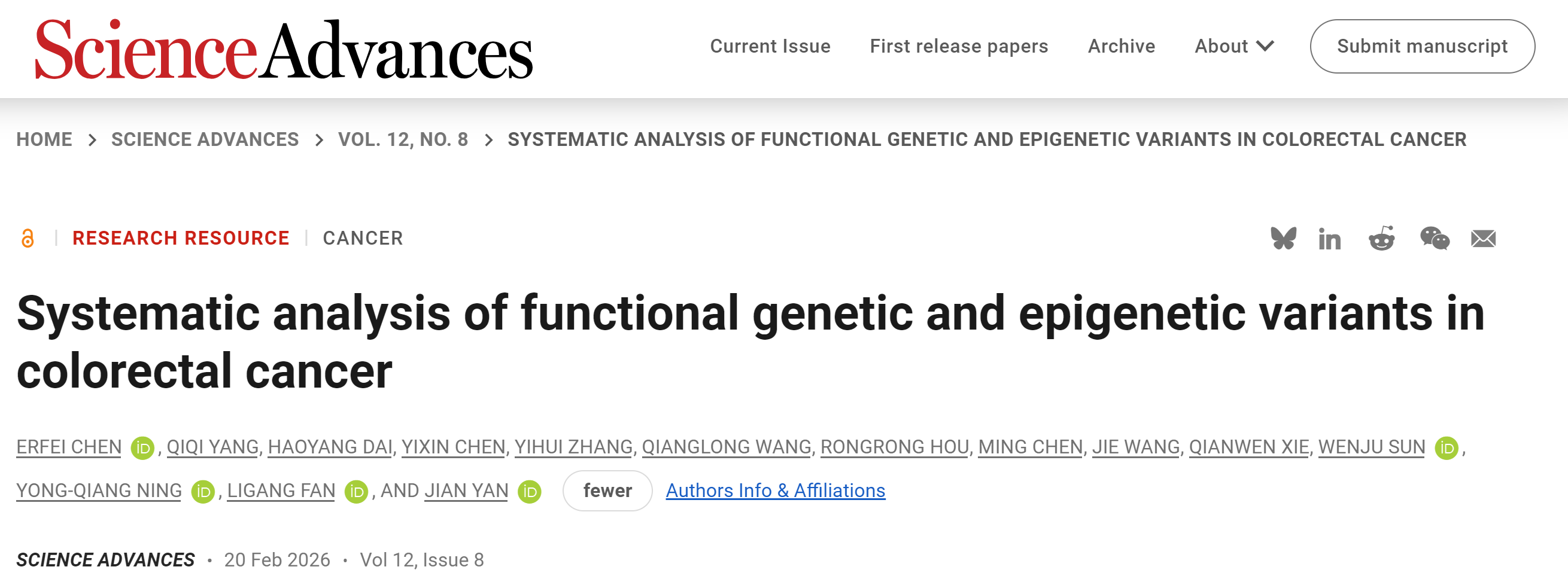 2026年2月20日,bwin必赢生命科学与医学部严健教授团队在Science Advances上发表了题为“Systematic analysis of functional genetic and epigenetic variants in colorectal cancer”的研究论文。该研究构建了一套整合性功能基因组学流程,首次在原发性与转移性结直肠癌细胞中,系统揭示了非编码SNP与CpG甲基化对增强子活性的调控网络,为理解结直肠癌的发病与转移机制提供了全新视角。