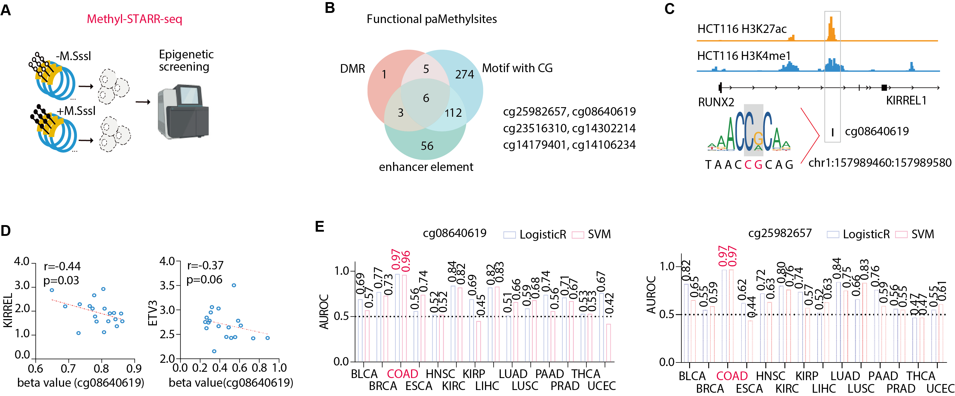 在表观遗传层面,研究结合机器学习方法,从大量CpG位点中筛选出两个具有高区分效能的甲基化标志物——cg08640619与cg25982657。其中,cg08640619的高甲基化干扰转录因子RUNX2结合,导致下游基因KIRREL1与ETV3表达下调。这两个标志物在结直肠癌早期检测中表现出极高的特异性(AUC > 0.96),展现出显著的临床转化潜力。