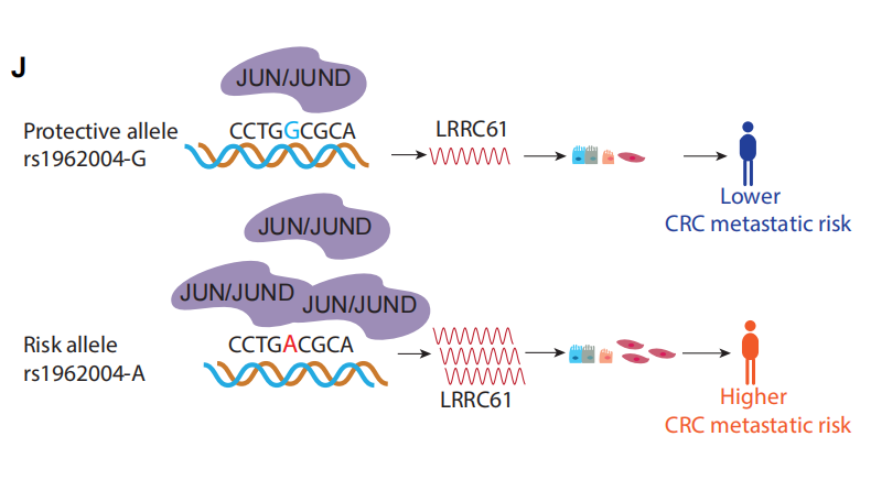 本研究在肠癌上皮细胞中鉴定出922个高可信功能性SNP,并构建这些变异可影响的转录因子及靶基因调控网络。通过对GWAS风险位点rs6061231及其连锁位点rs67941642的深入解析,研究揭示了rs67941642的T等位通过增强转录因子GFI1结合,上调抑癌基因TAF4表达,进而抑制肿瘤恶性表型的分子机制。尤为重要的是,研究利用同源配对细胞模型(SW480/SW620),首次系统识别出3,136个转移获得性SNP与3,008个转移特异性甲基化敏感元件,揭示了肿瘤转移过程中增强子序列变异调控的新机制。其中,转移获得性变异rs1962004通过招募AP-1转录因子(JUN/JUND),激活靶基因LRRC61表达,显著促进癌细胞转移并与患者不良预后相关。